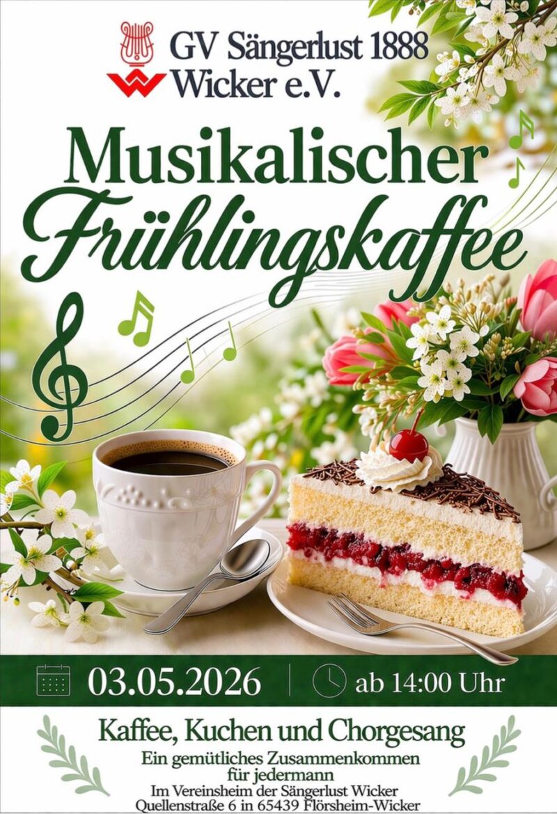 Kaffee – Kuchen – Chorgesang Wir laden ein zum Musikalischen Frühlingskaffee am Sonntag, 3. Mai ab 14:00 Uhr im Vereinsheim der Sängerlust Wicker in der Goldbornstr. 6. Duftender Kaffee und ein reichhaltiges, abwechslungsreiches Kuchenbüffett stehen für das leibliche Wohl unserer Gäste bereit. Für die musikalische Unterhaltung sorgen die drei Sängerlustchöre. Natürlich gibt es auch…